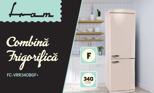 Product Description: Fram FC-VRR340BGF+ este o combina frigorifica cu un design stil retro, atragatoare multumita liniilor rotunjite si culorii Bej, ce are o capacitate de 340 l. Are tehnologie Less Frost, si se incadreaza la clasa energetica F.
