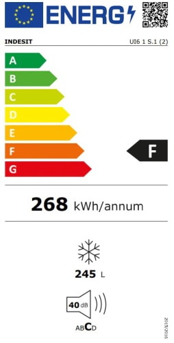 Product Description: Indesit UI61S1 este un congelator de culoare Argintie, model cu un volum net de 245 l, spatiu impartit cu ajutorul a 6 compartimente. Este incadrat la clasa energetica F, pe sistemul nou.