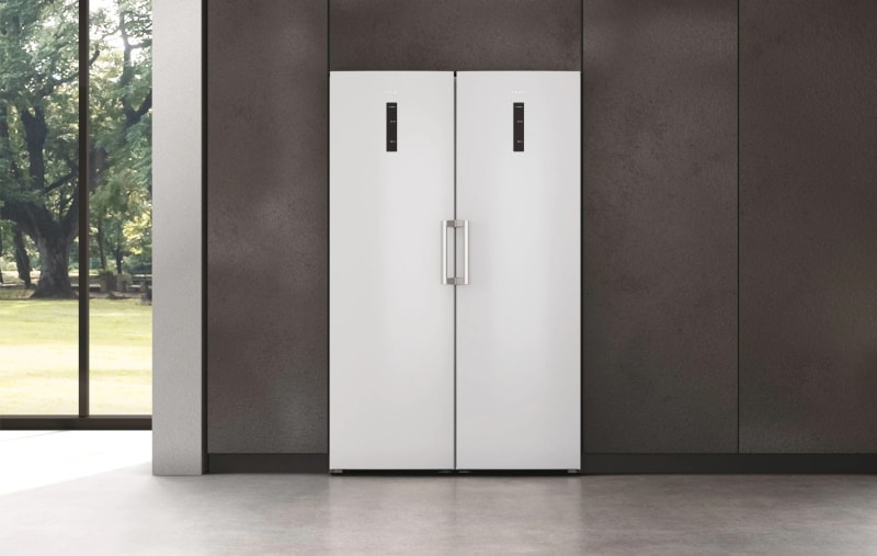 Fiind un frigider cu o singura usa, si fara compartiment pentru congelator, intregul volum din interior este dedicat racitorului. Aveti 330 l disponibili, mult peste ce obtineti de la un frigider tipic sau de la o combina frigorifica. Daca doriti, puteti combina acest frigider cu un congelator de la acelasi producator, cu un volum interior similar. Vedeti in poza de mai sus, cum arata aceasta combinatie de racitor + congelator dedicat.