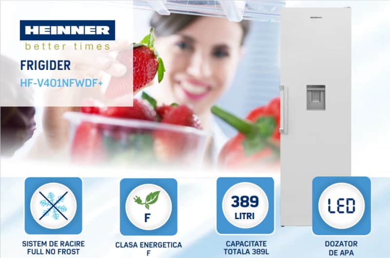 Review: Heinner HF-V401NFWDF+, Frigider cu o Usa de 389 l, Full No Frost, Dozator Apa Rece, Clasa F – Pareri si Review
