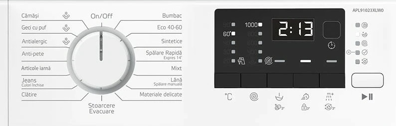 Masina are o lista destul de lunga de 15-16 programe spalare, de la cel Rapid de 14 minute, pana la cel ECO de 3 h 48 min. Se pot selecta 1 din cele 5 trepte de temperatura.