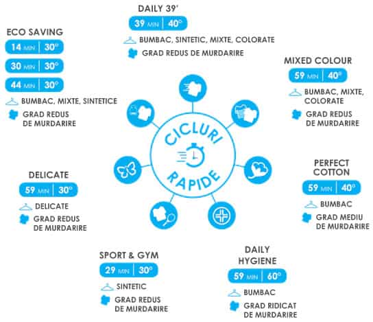 Aveti 16 programe de spalare la dispozitie, printre care mai multe optiuni rapide (14-44 minute), variante Eco, Lana, Jeans, Sport, Hygiene, sau spalare manuala. Are 5 trepte de temperatura.
