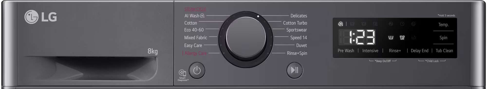 Steam™: Tehnologia de spălare cu aburi este excelentă pentru îndepărtarea alergenilor și pentru o curățare mai profundă. Folosind acest program, am observat că hainele ies mai proaspete și mai curate, ideal pentru membrii familiei cu piele sensibilă.