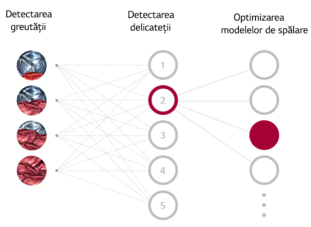 - AI DD: tehnologie ce utilizeaza informatii obtinute de catre LG, pentru a optimiza spalarea rufelor. Acestea vor fi tratate mai bine, cu miscari potrivite pentru delicatetea materialului si greutatea sa. Astfel, uzura materialului este cu pana la 18% mai mica, iar consumul de energie este redus cu pana la 28%.