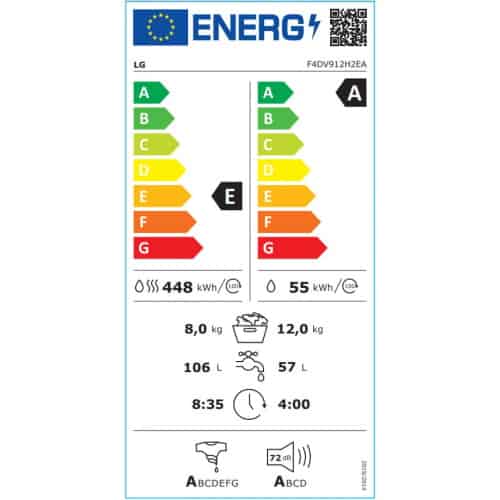 Product Description: LG F4DV912H2EA este o masina de spalat rufe ce are si functie de uscare. Spala 12 kg rufe, usuca 8 kg, iar centrifugarea atinge 1400 RPM. Este un model din clasa A, cu motor Inverter Direct Drive si cateva tehnologii interesante (Smart Diagnosis, TurboWash, AI DD, Steam).
