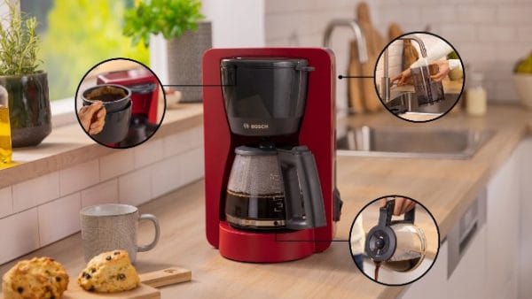 Bosch My Moment TKA2M114 este gândită pentru confort maxim și ușurință în utilizare. Rezervorul de apă este transparent și detașabil, ceea ce permite o umplere rapidă și precisă. Filtrul rabatabil și detasabil facilitează curățarea, iar designul modern, în nuanțe de roșu lucios cu accente mate, adaugă un strop de culoare oricărei bucătării. În plus, cana din sticlă termorezistentă menține temperatura cafelei, iar compartimentul special pentru cablu contribuie la o depozitare ordonată și practică.