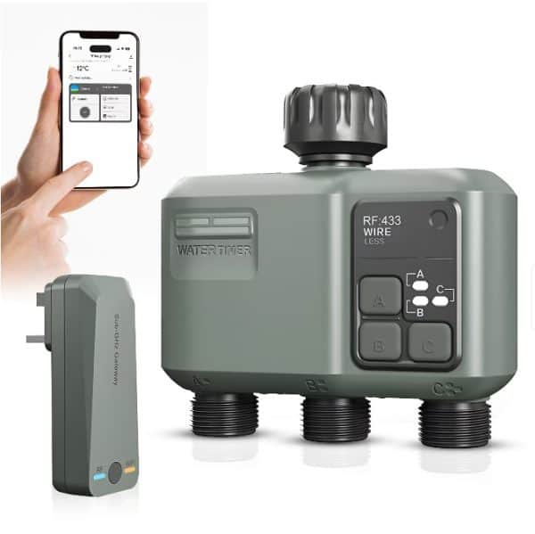 Zadabso® e genul de timer de robinet care chiar îți ușurează viața: îl legi la rețea, îl pui pe baterii și de acolo controlezi totul din telefon. Ai simultan WiFi și Bluetooth, așa că pornești manual sau programezi din aplicația Tuya, inclusiv când ești plecat. Trei ieșiri independente înseamnă trei zone separate – gazon, straturi, picurare – cu durată și frecvență diferite, fără să te complici cu tablouri sau cabluri. „Rain delay” oprește udarea când plouă și te ajută să nu irosești apă.