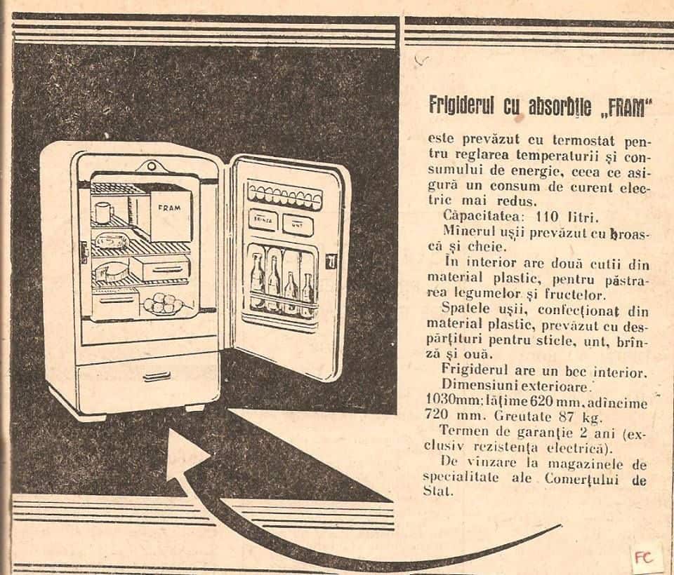 Mai jos, aveti si o poza de promovare al unui frigider cu absorbtie FRAM, ce avea capacitatea de 110 l, 2 cutii pentru fructe/legume, bec interior, si chiar si broasca si cheie, pentru a putea fi incuiat. Avea 2 ani garantie.